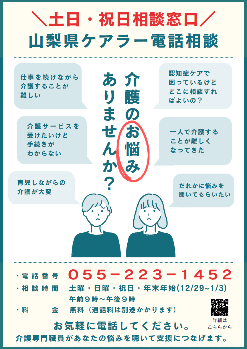 山梨県では、家族や身近な方の介護を担うケアラーの方々への支援をより充実させるため、土日祝日専用の電話相談窓口「山梨県ケアラー電話相談」を新たに開設しました。